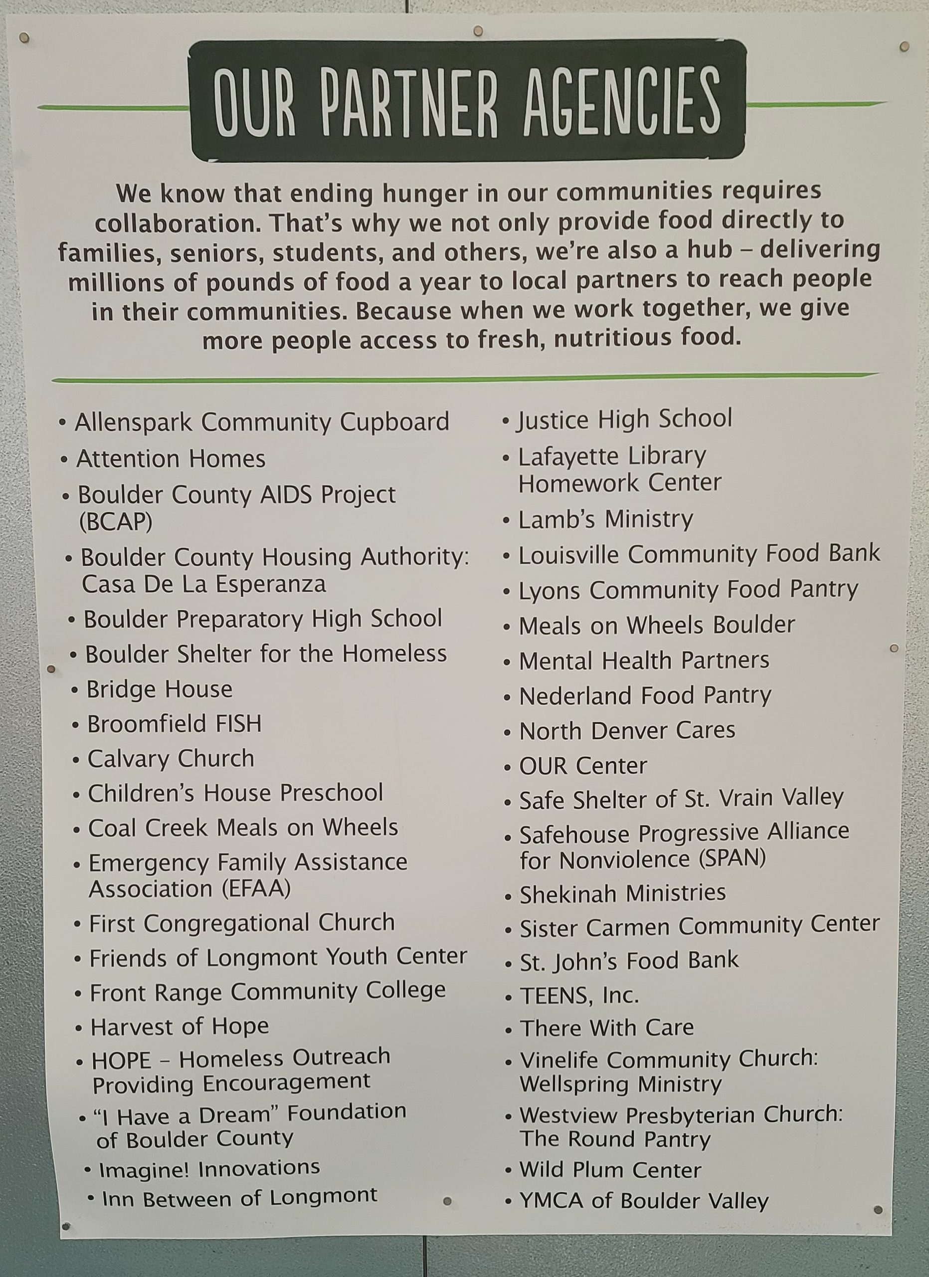 Community Food Share also provides food to partner organizations such as Emergency Family Assistance Association (EFAA), Attention Homes, Coal Creek Meals on Wheels, University of Colorado Boulder, Front Range Community College, NEDERLAND FOOD PANTRY, YMCA of Boulder Valley, North Denver Cares Food Pantry, and many more.